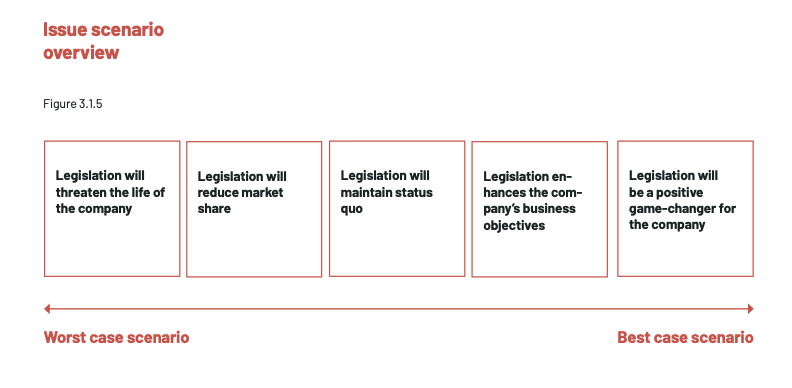 So now you know your issues, the stakeholders and their position and you have identified the drivers in the public agenda. But an important next step is of course to identify the different scenarios on your particular issues. Most companies in the survey had between 4-8 issues (median of 5), but everyone should know that you will not succeed in the way you desire on all issues. The most likely outcome – like many things in life – is that you compromise or seek out the minimum acceptable solution in the political environment you are facing. Thus, the experienced PA professionals know that politics require pragmatism and a “best possible solution” approach.